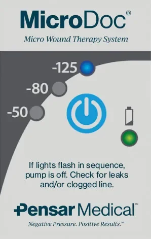 MicroDoc’s user-friendly control panel offers three continuous pressure settings (-50, -80, -125 mmHg) for personalized wound therapy and wound care.